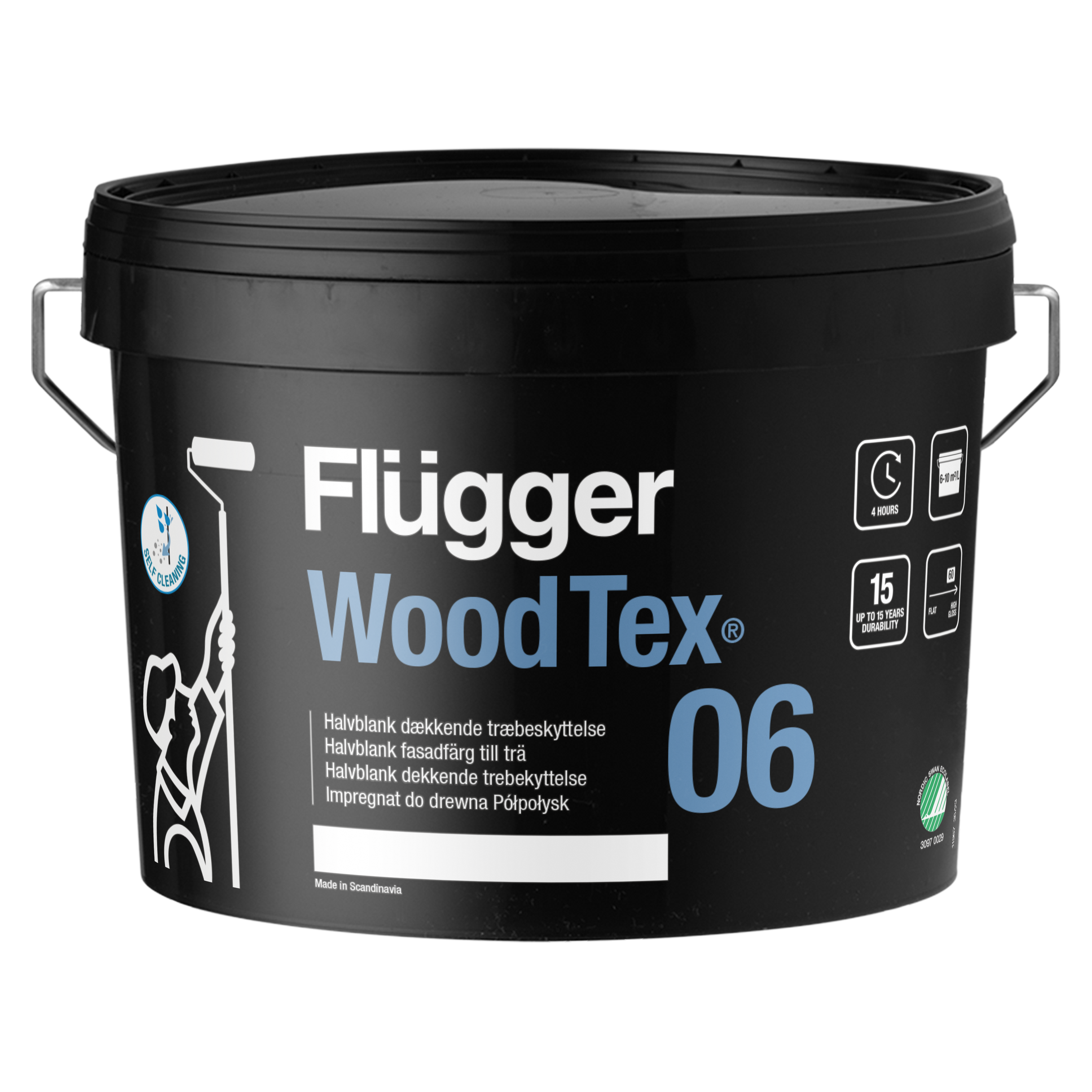 Flügger 06 Wood Tex Paint W 60 giver træet en meget vejrbestandig overflade med maksimal holdbarhed, glans og kulørstabilitet. Hæmmer mug- og skimmelvækst på overfladen.