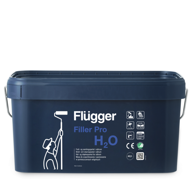 Flügger Filler Pro H20 er fugtstabil rulle vådrumsspartel med maksimal fyldeevne til badeværelser og andre rum, der udsættes for skiftende fugtpåvirkning. Færdigbehandles med vægbeklædning eller egnet loft- eller vægmaling.